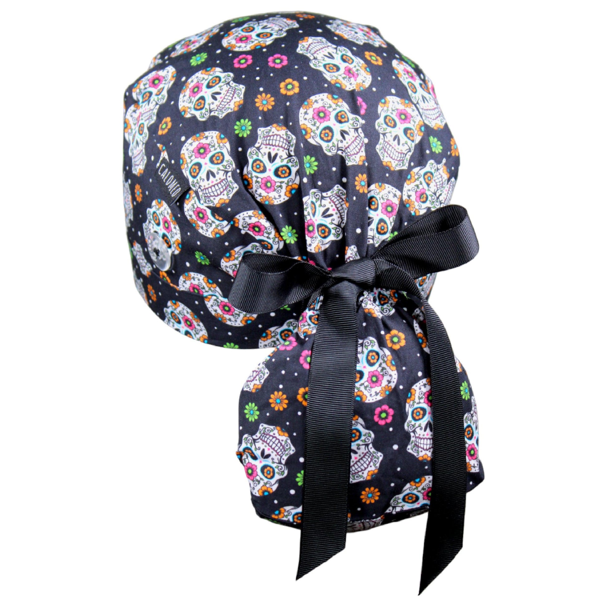 Candy Skulls on Black Ponytail Scrub Cap - 100% Cotton